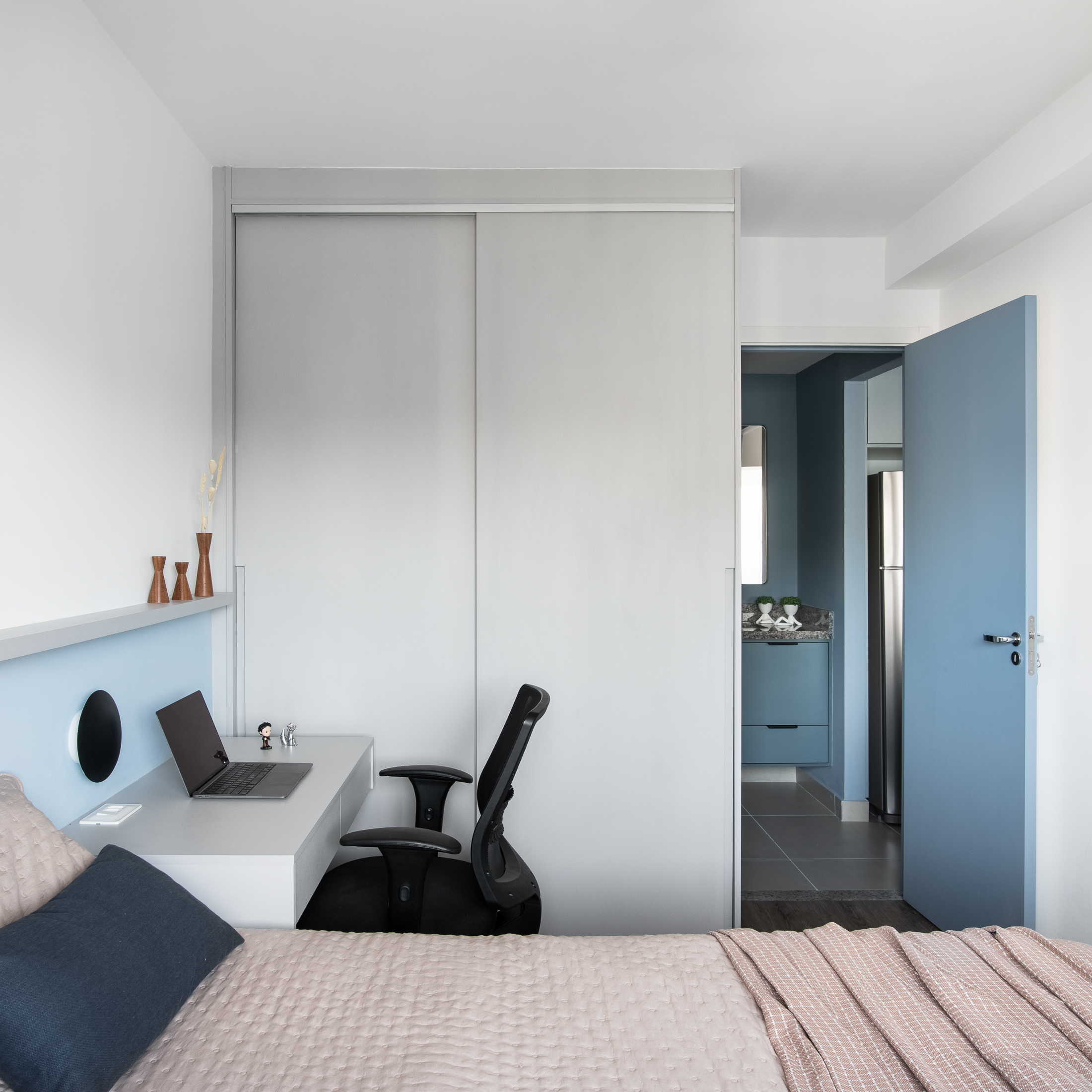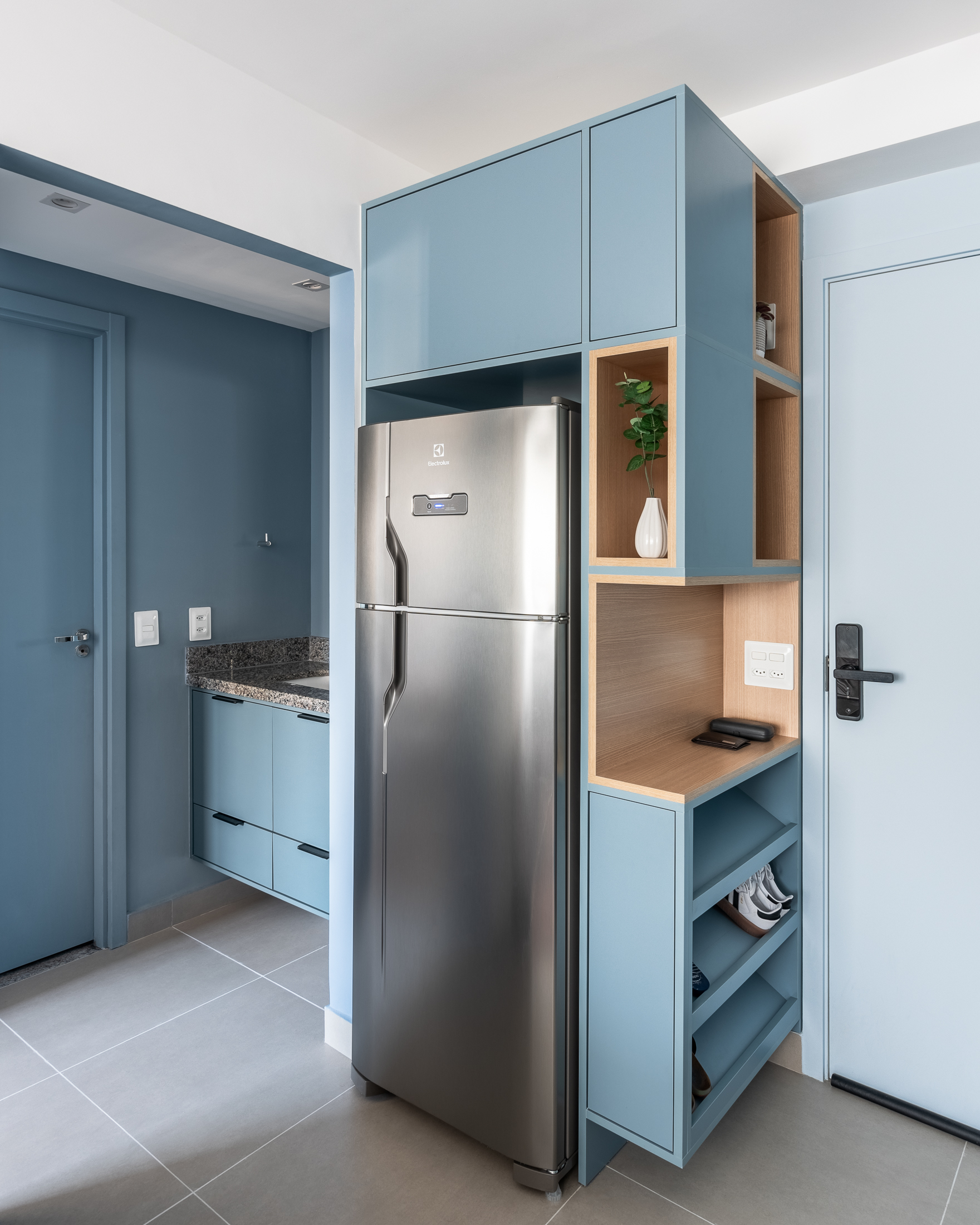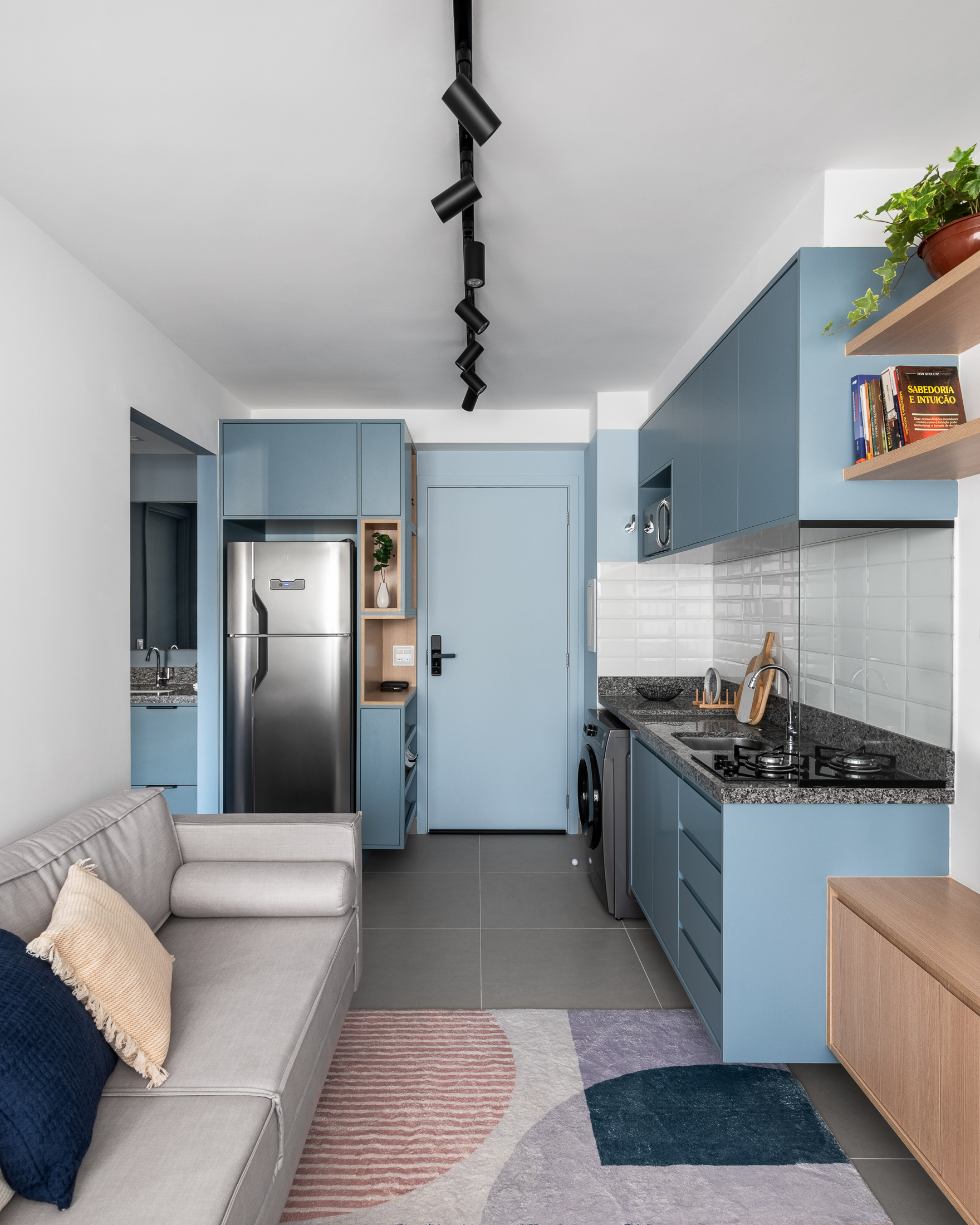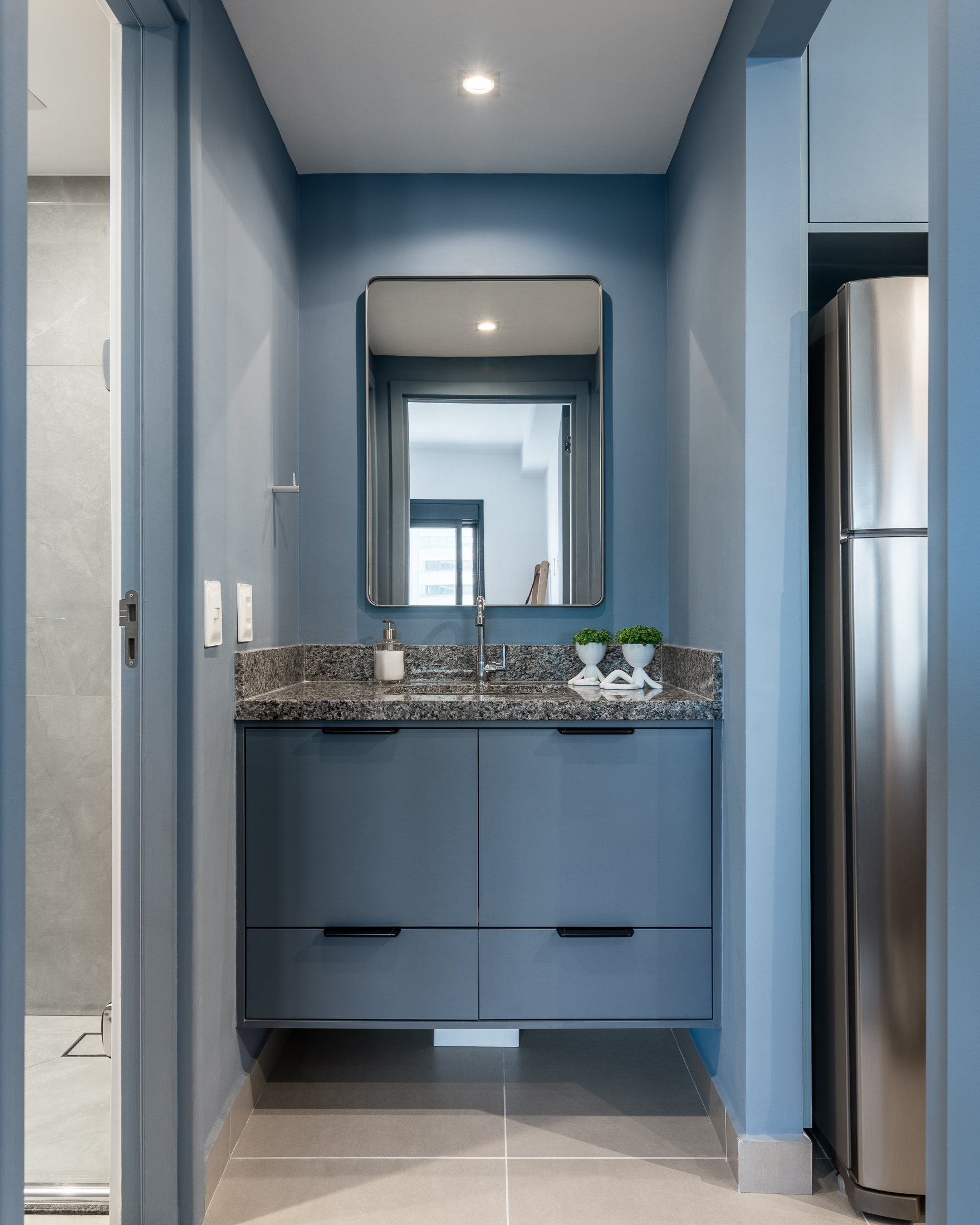 A escolha de uma paleta de tons de azul trouxe muita personalidade para este apartamento que precisava ter um diferencial para ser atrativo para locação. A marcenaria planejada, projeto de iluminação e ambientes integrados, tudo para otimizar espaço e trazer funcionalidades para o futuro inquilino.