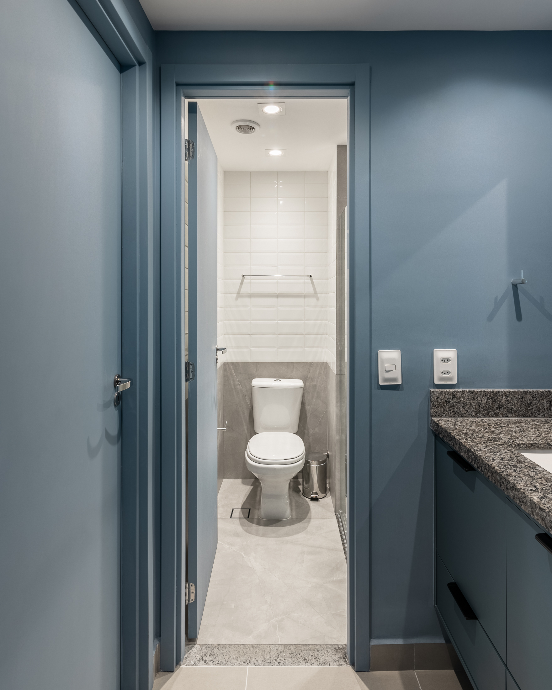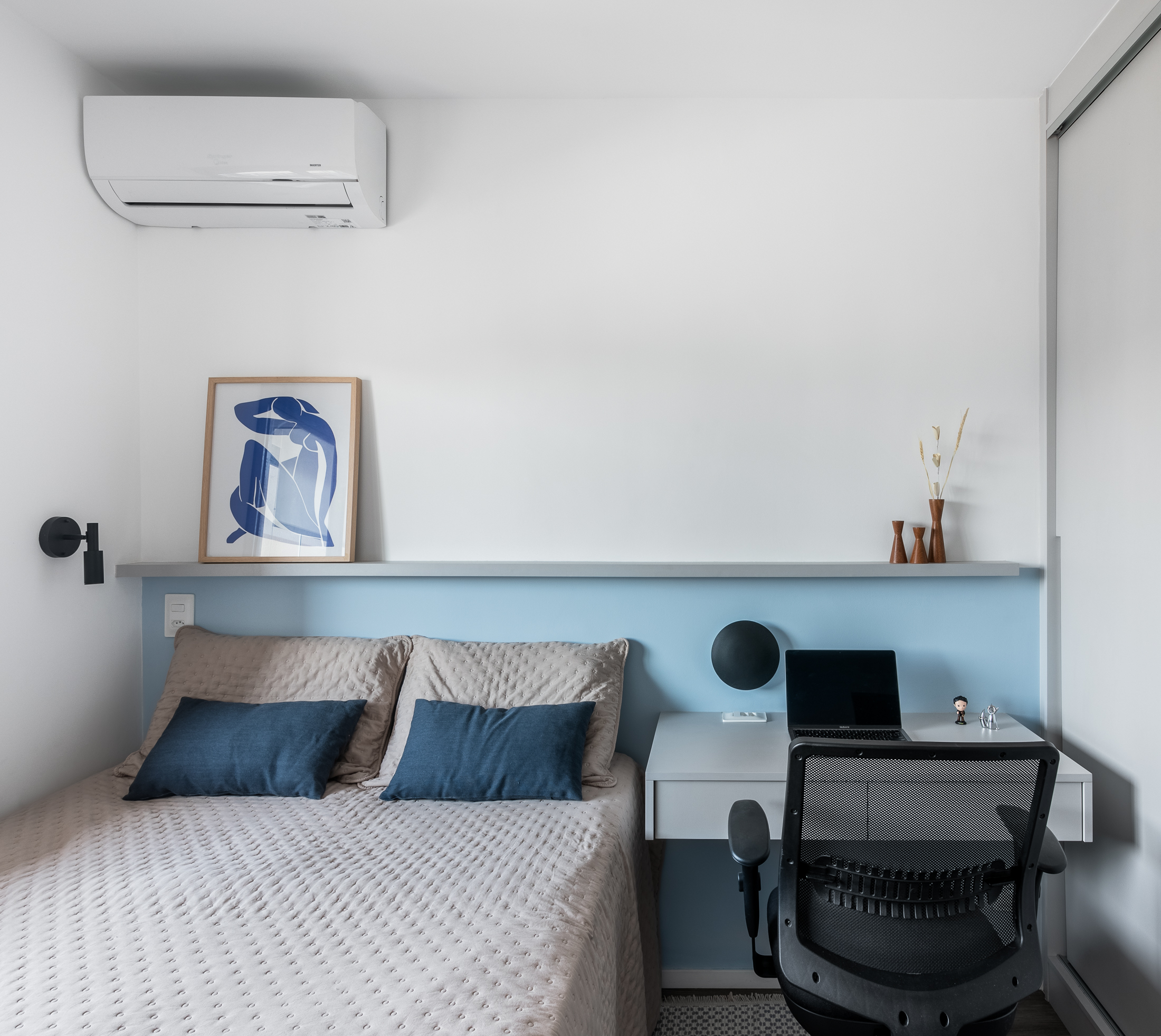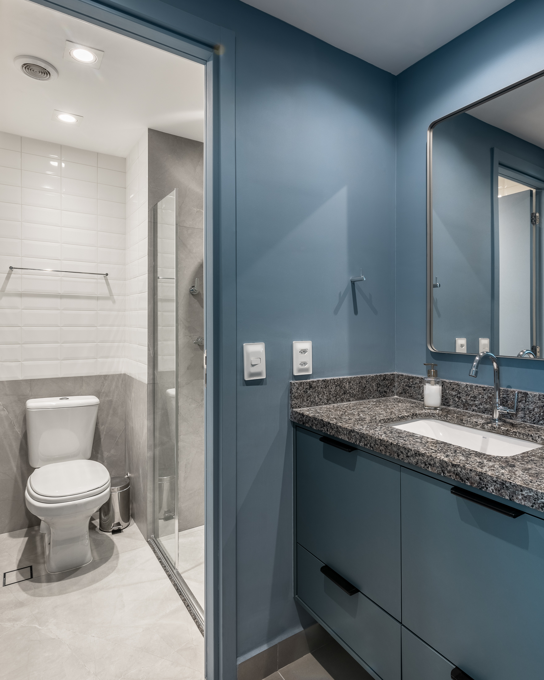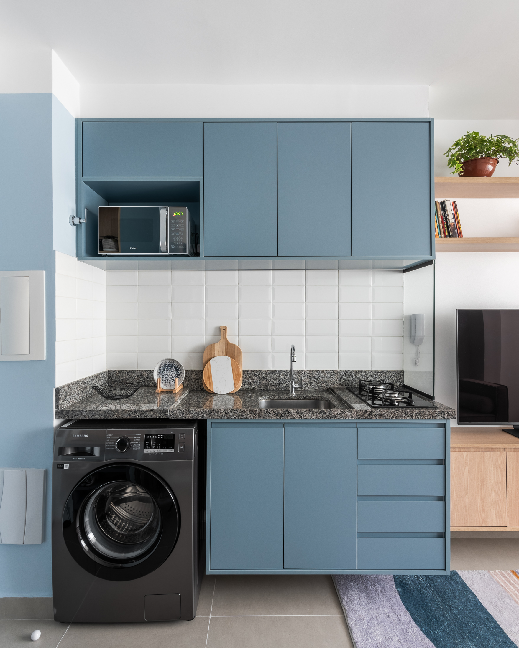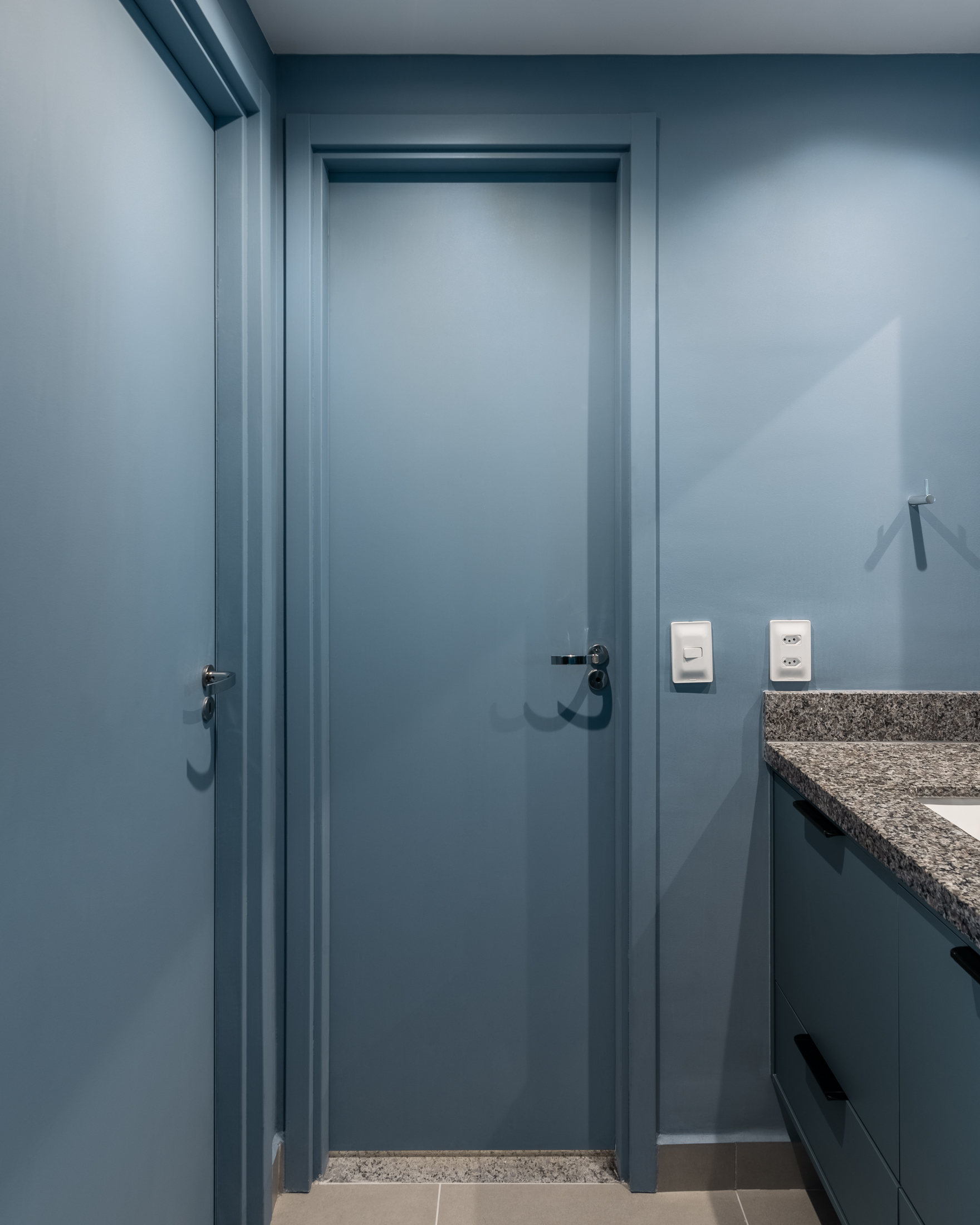 A escolha de uma paleta de tons de azul trouxe muita personalidade para este apartamento que precisava ter um diferencial para ser atrativo para locação. A marcenaria planejada, projeto de iluminação e ambientes integrados, tudo para otimizar espaço e trazer funcionalidades para o futuro inquilino.