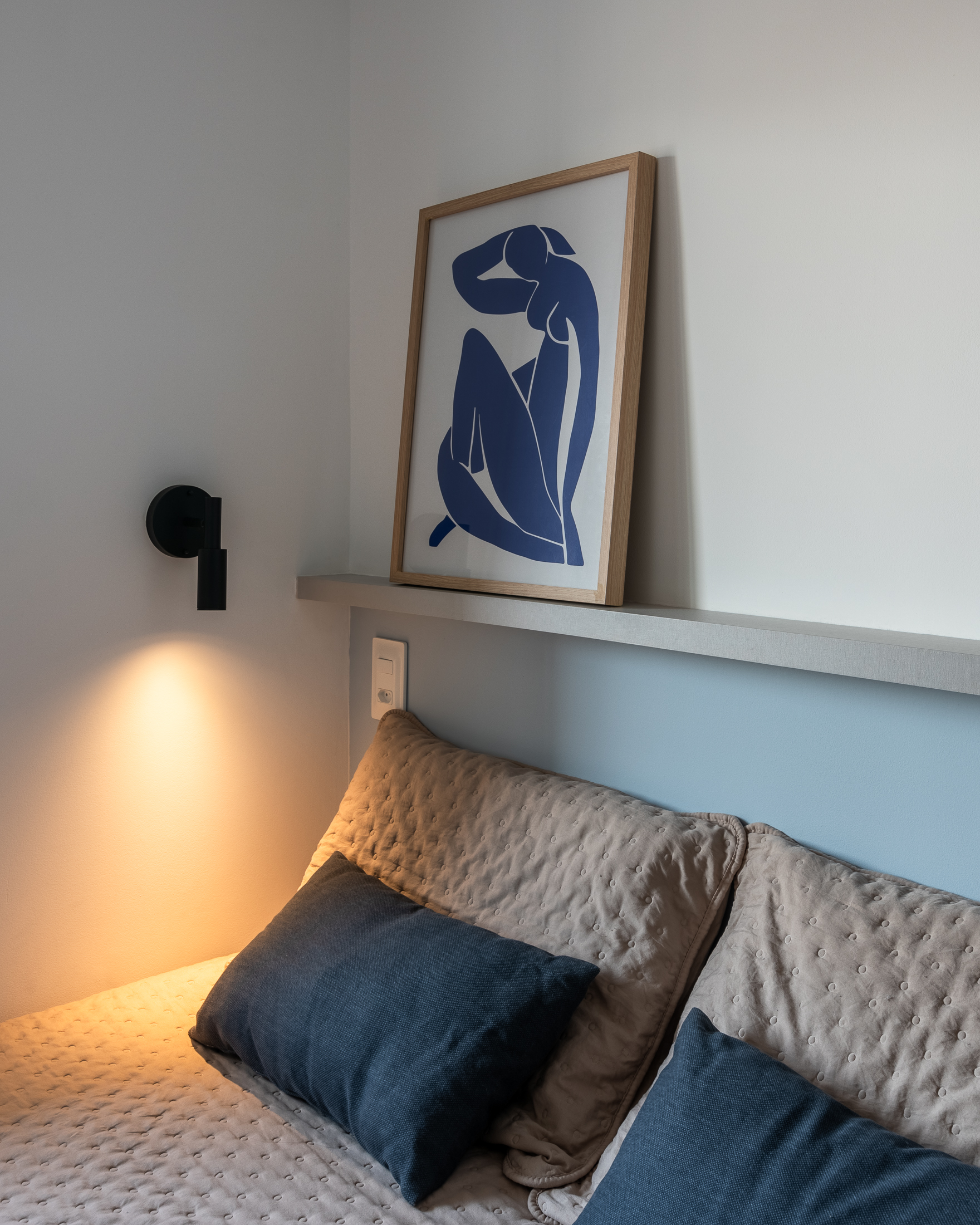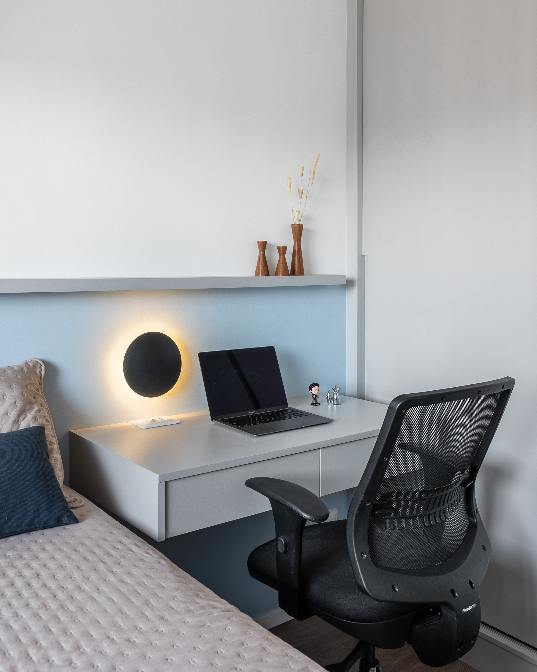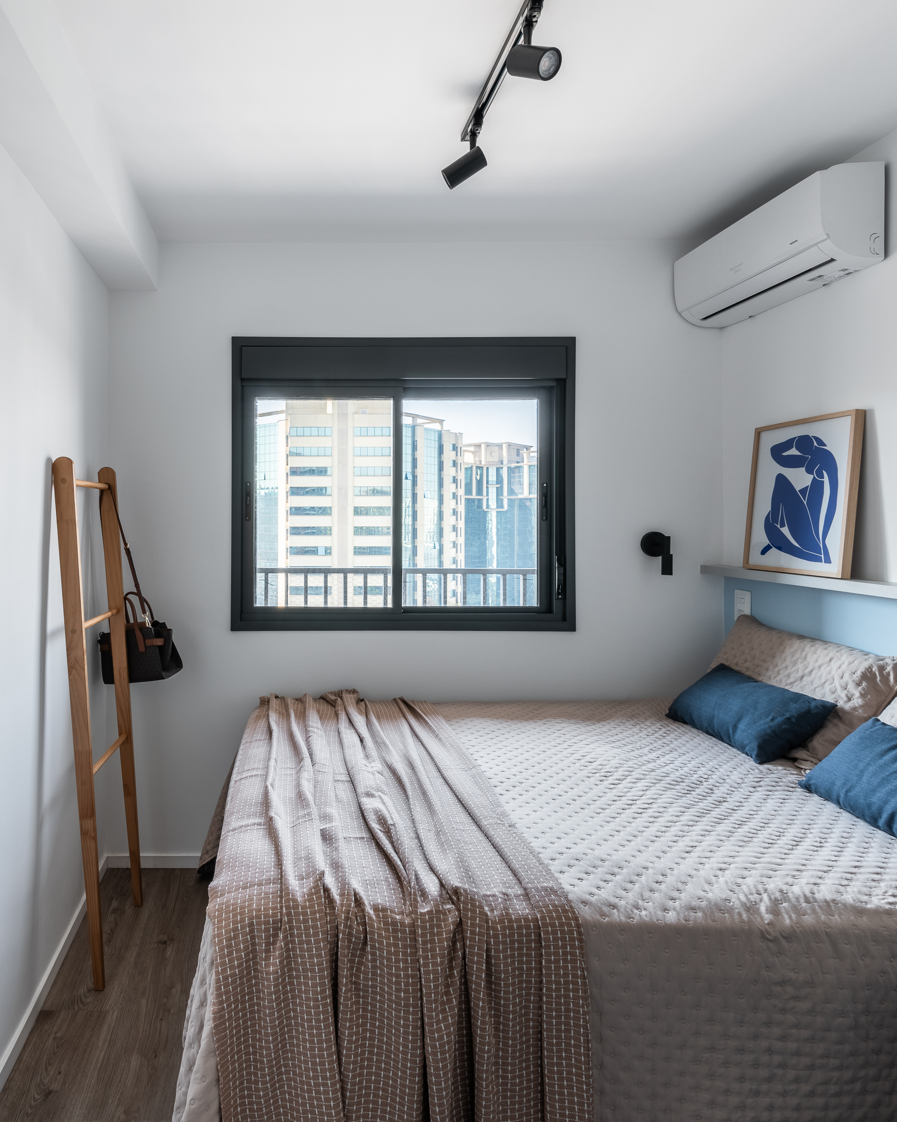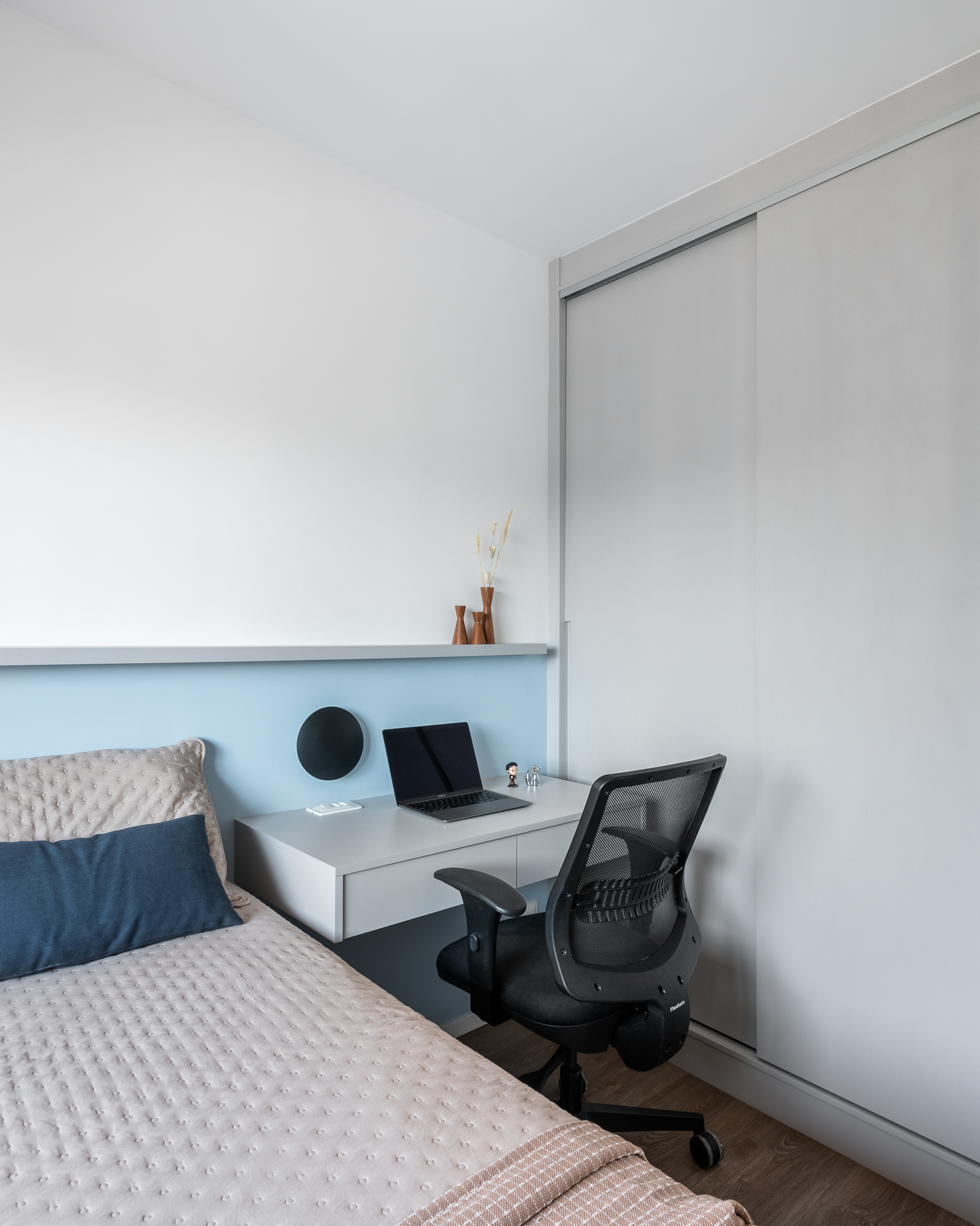 A escolha de uma paleta de tons de azul trouxe muita personalidade para este apartamento que precisava ter um diferencial para ser atrativo para locação. A marcenaria planejada, projeto de iluminação e ambientes integrados, tudo para otimizar espaço e trazer funcionalidades para o futuro inquilino.