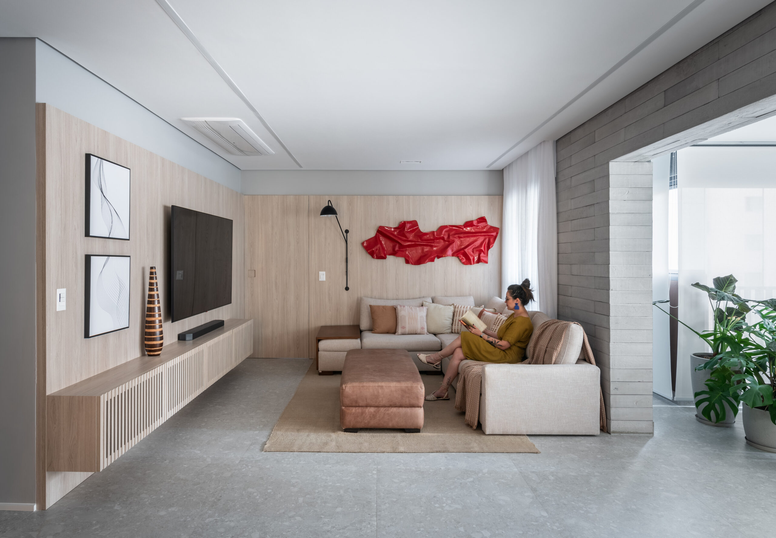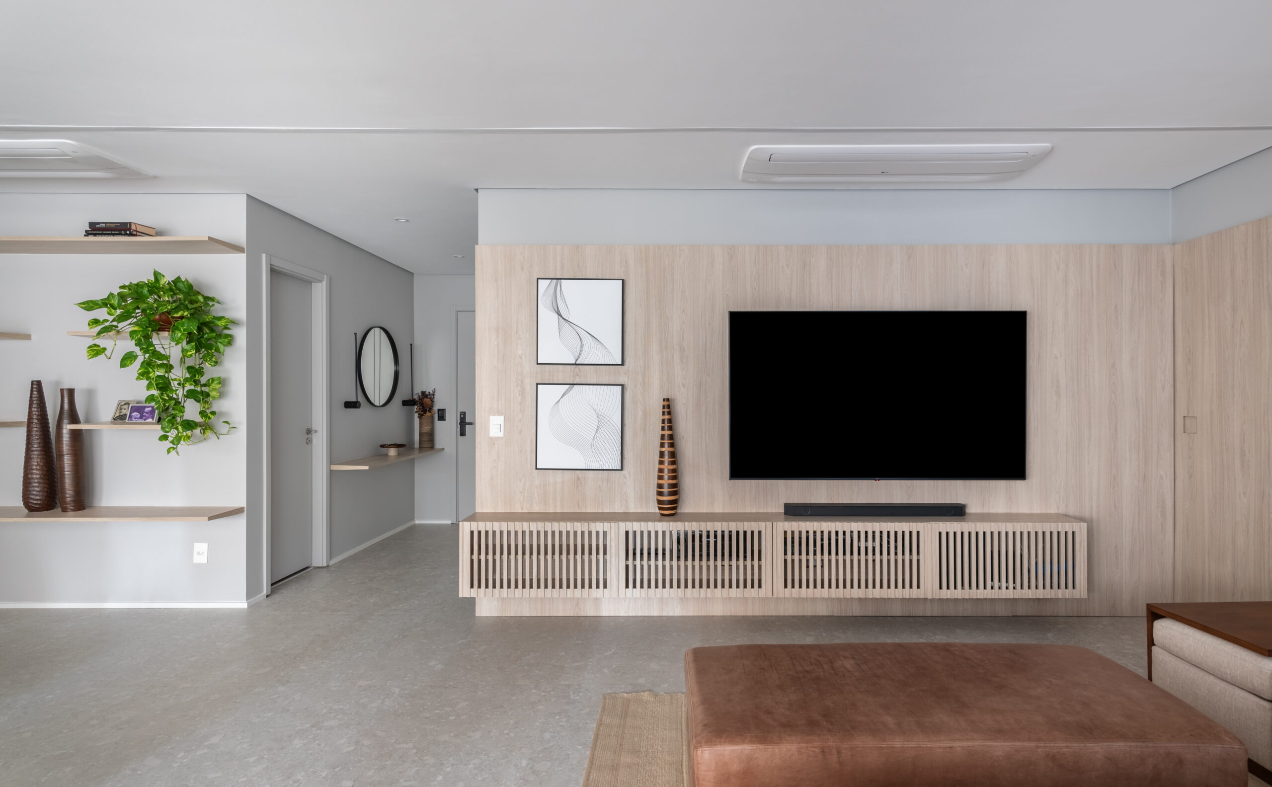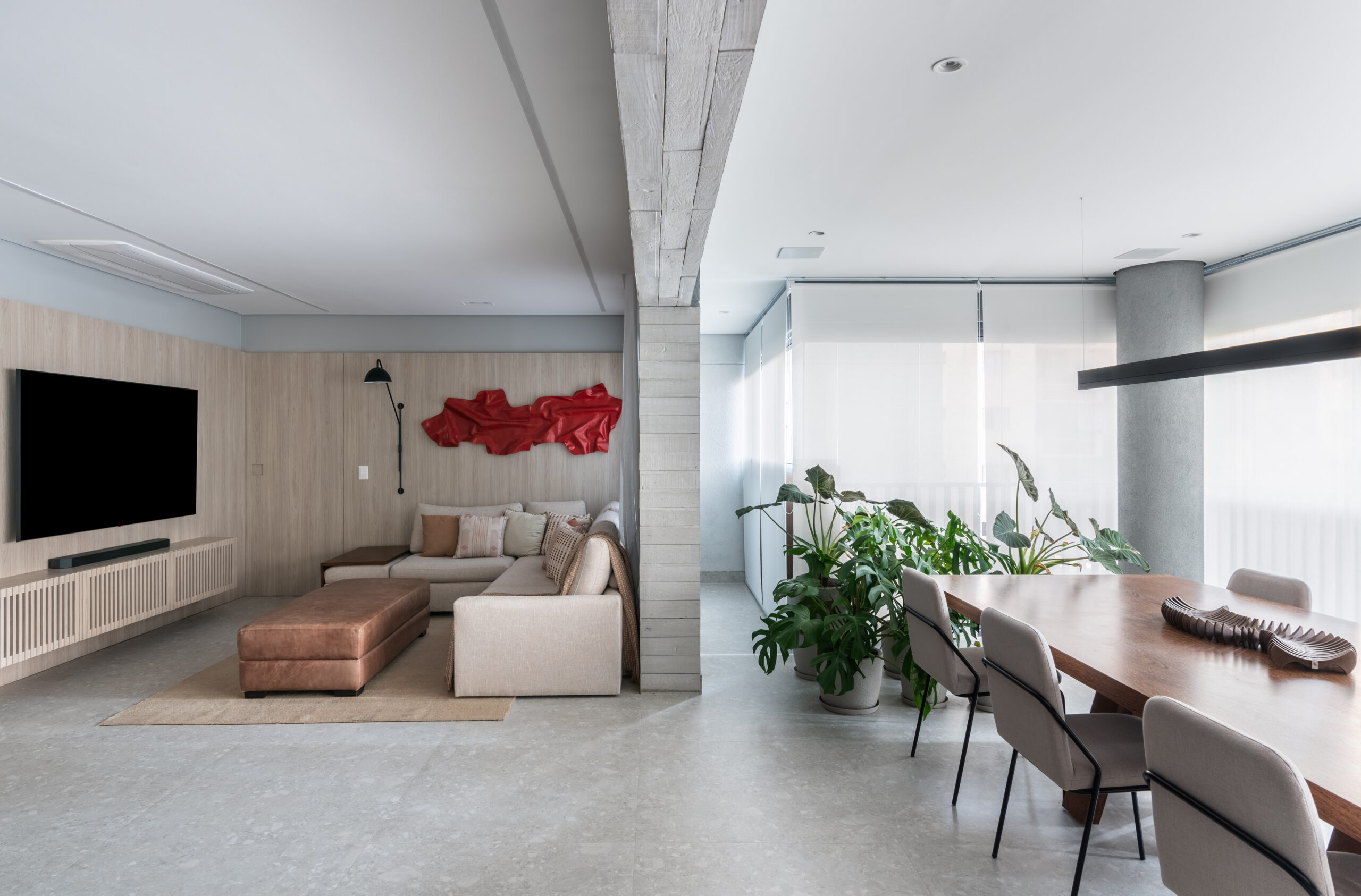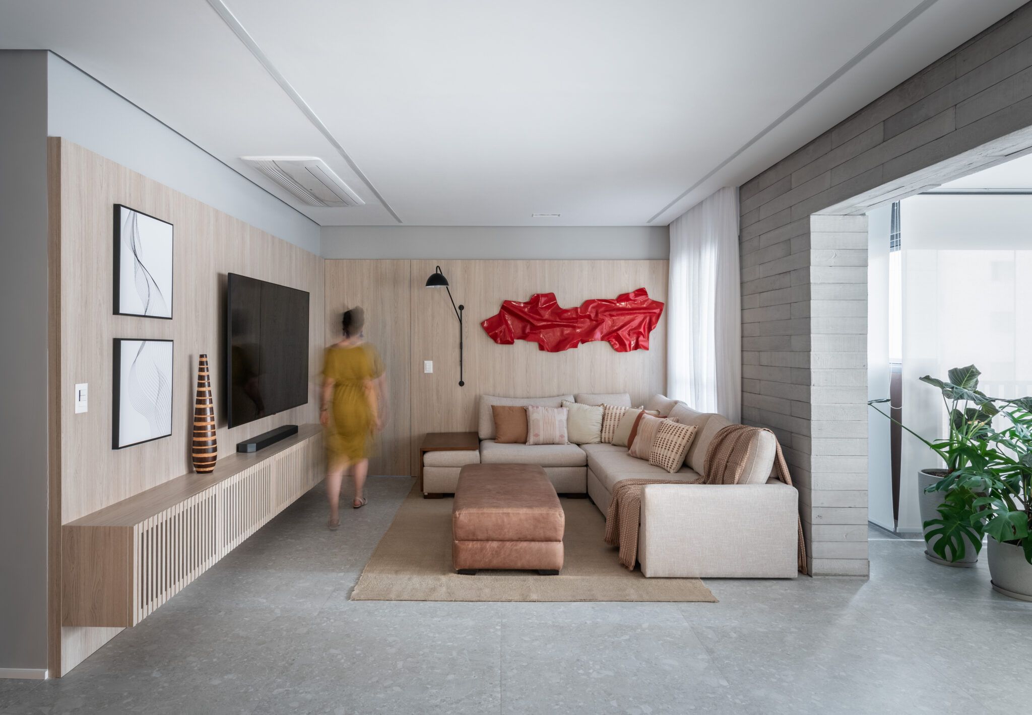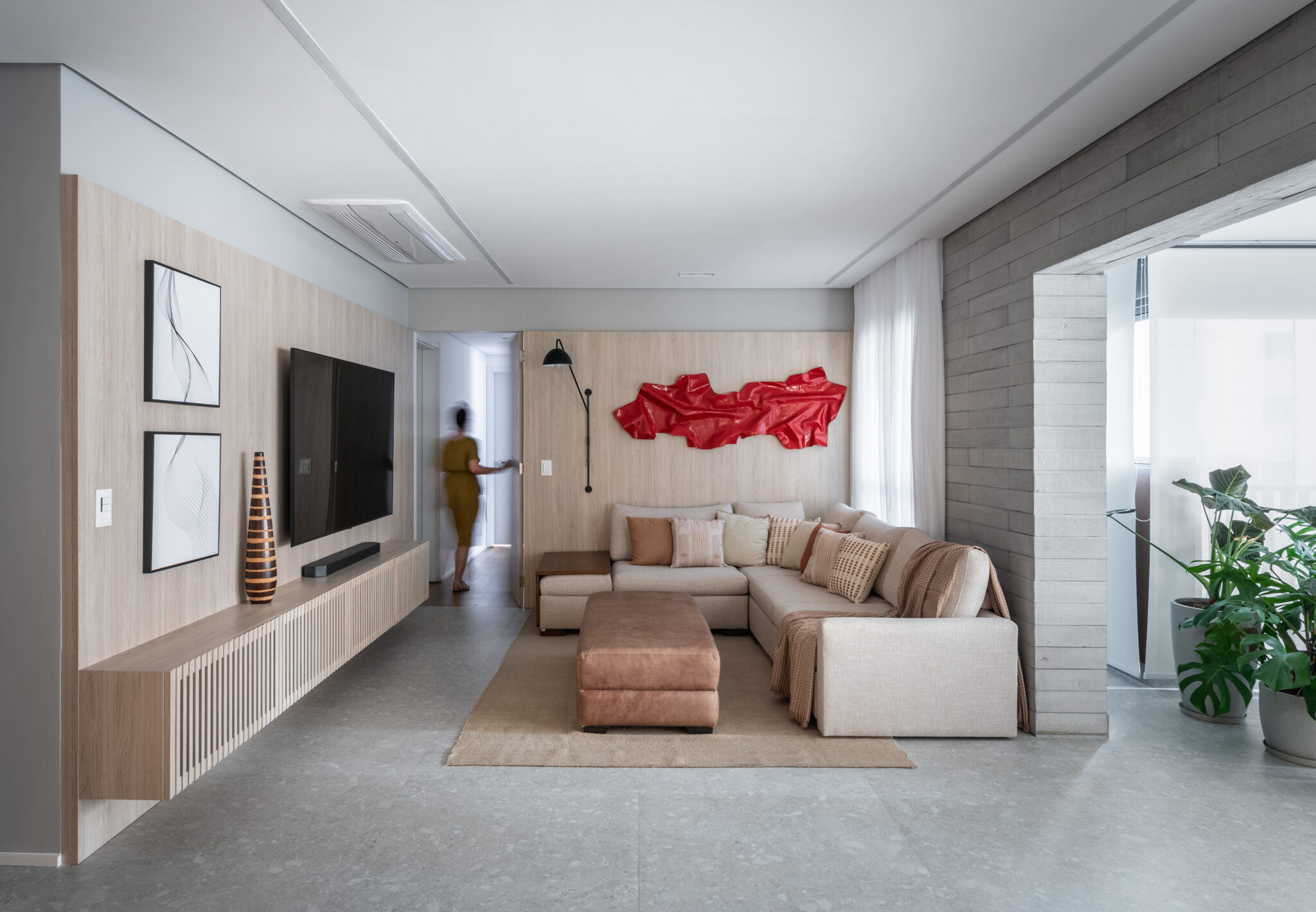 Este apartamento de 150m² tem o estilo Japandi, ou seja, a junção de dois estilos que se complementam perfeitamente: o escandinavo com o minimalismo japonês.