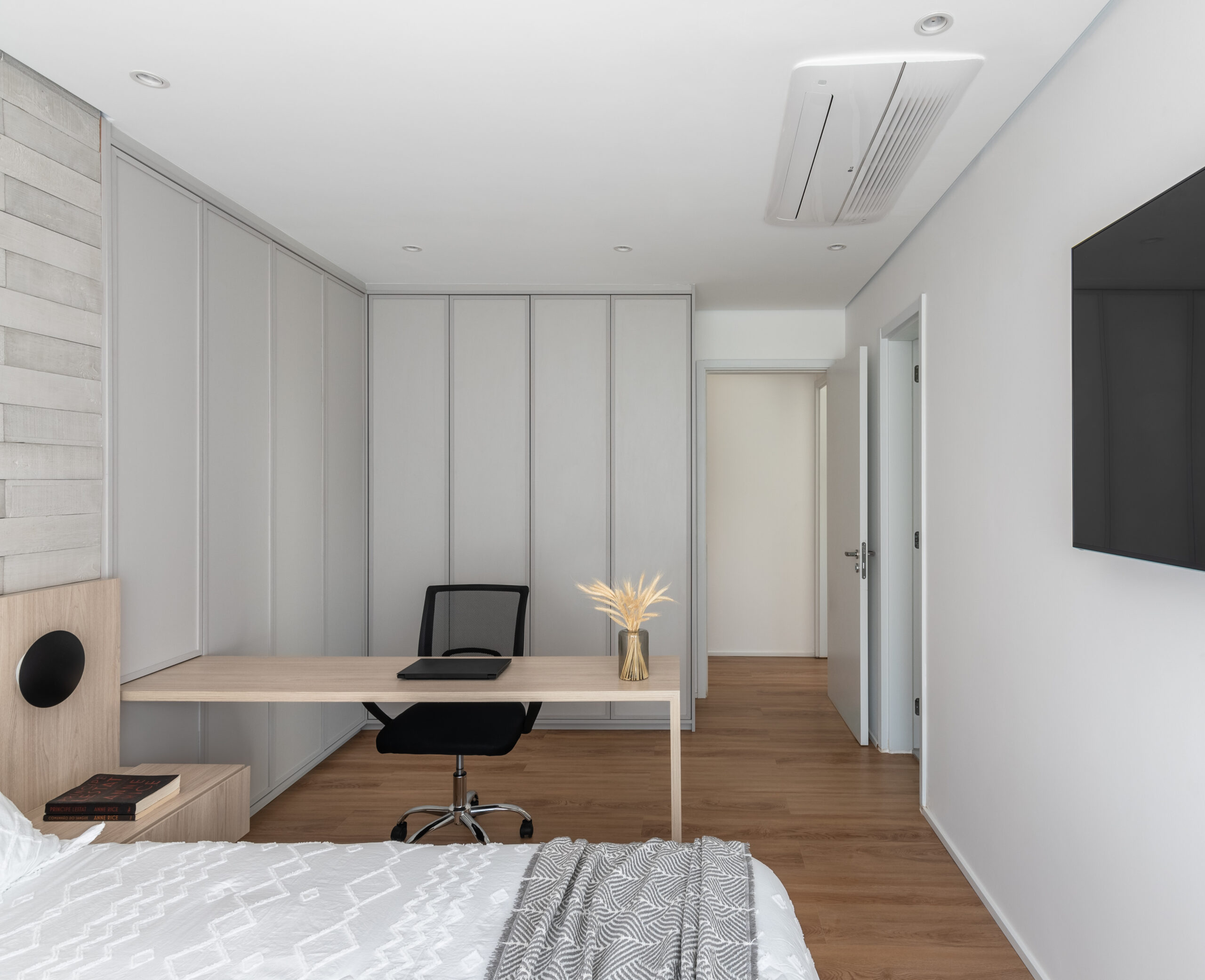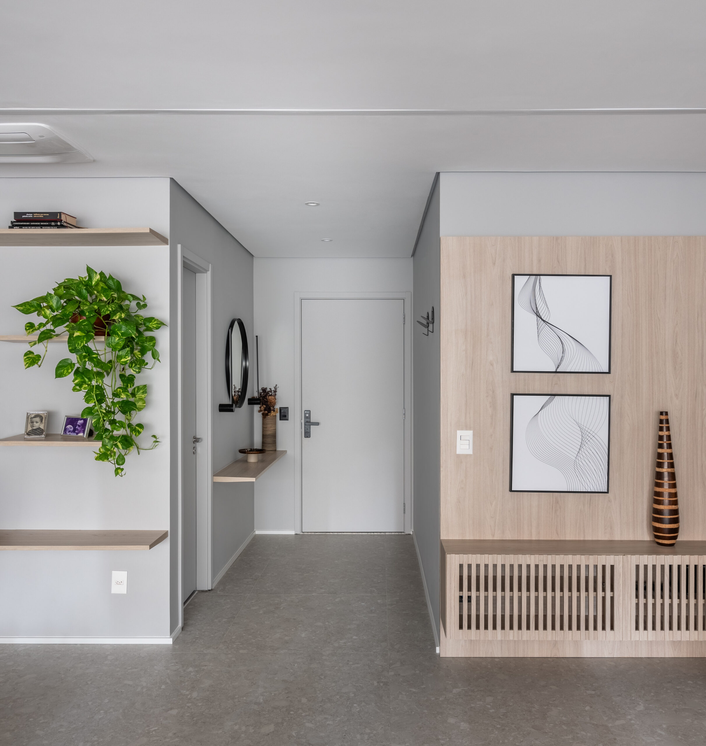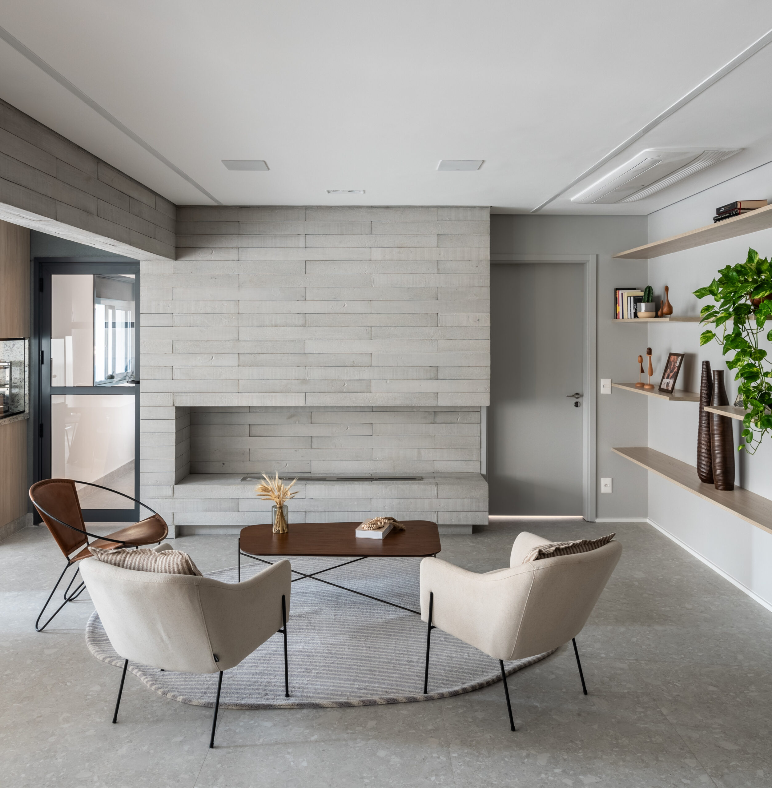 O pedido do cliente é exatamente este, criar um ambiente minimalista, com poucas cores, porém aconchegante. Um projeto inteligente aproveitando parte do que a construtora já entrega e mesclando com peças de mobiliário e decoração que ele já possui.