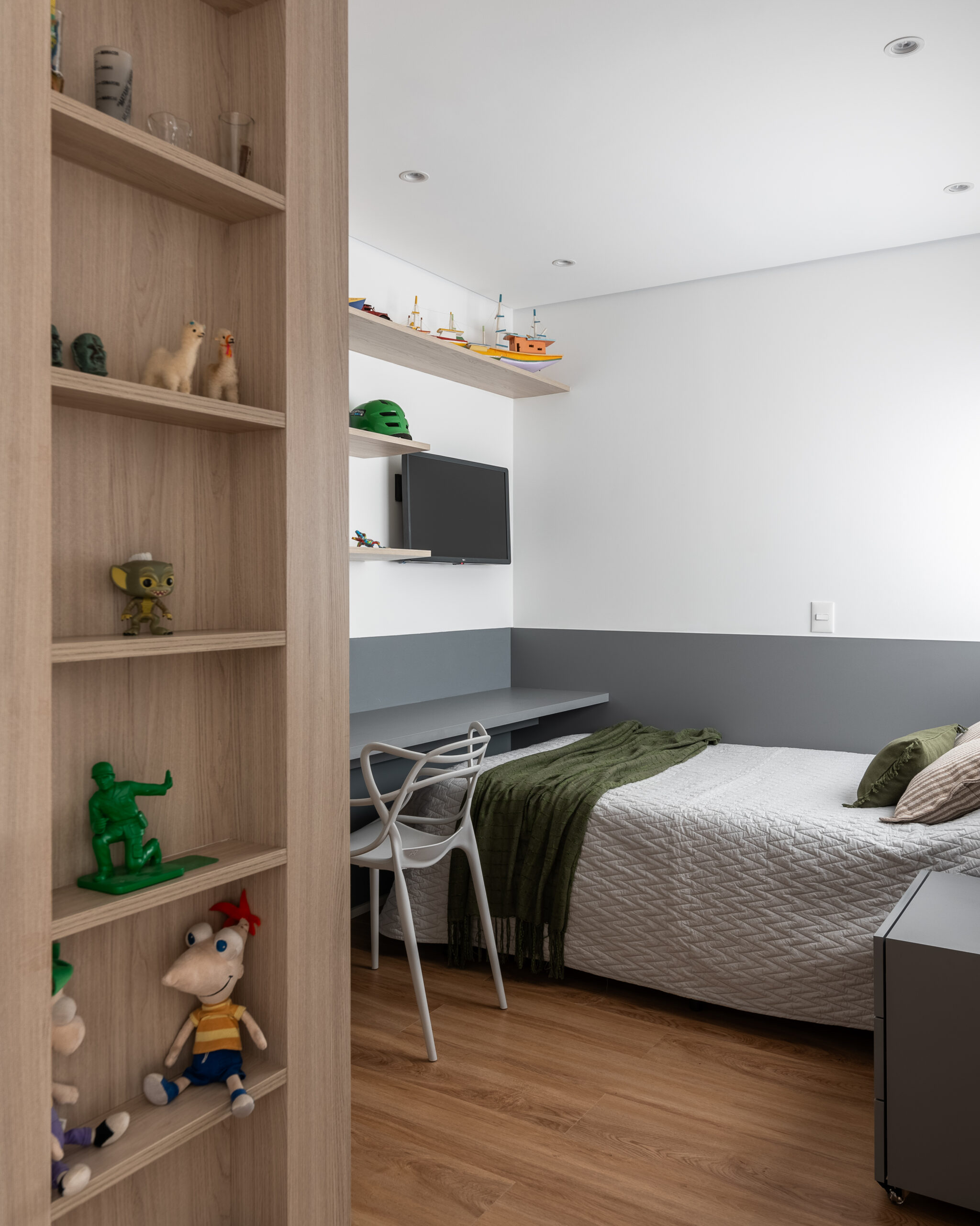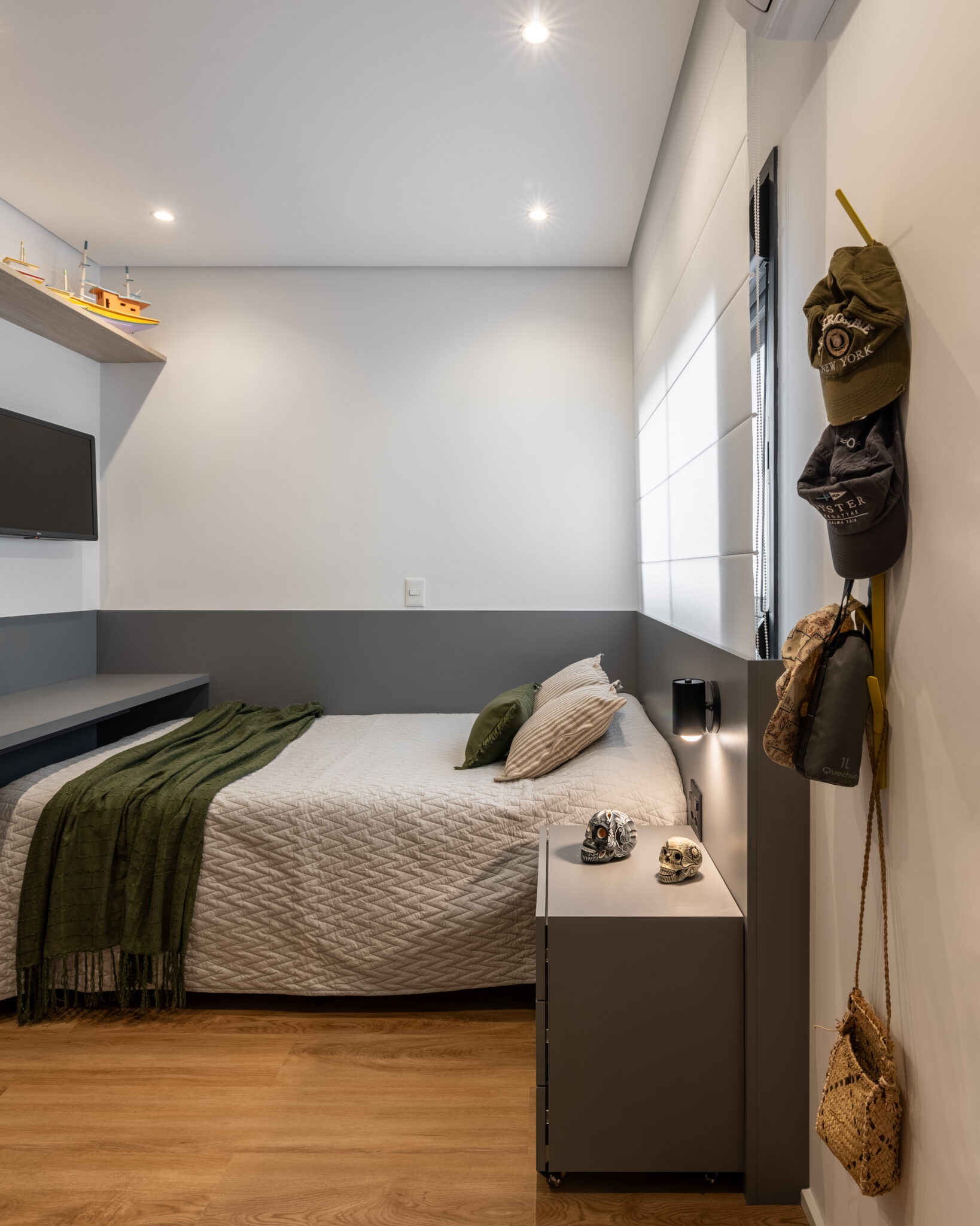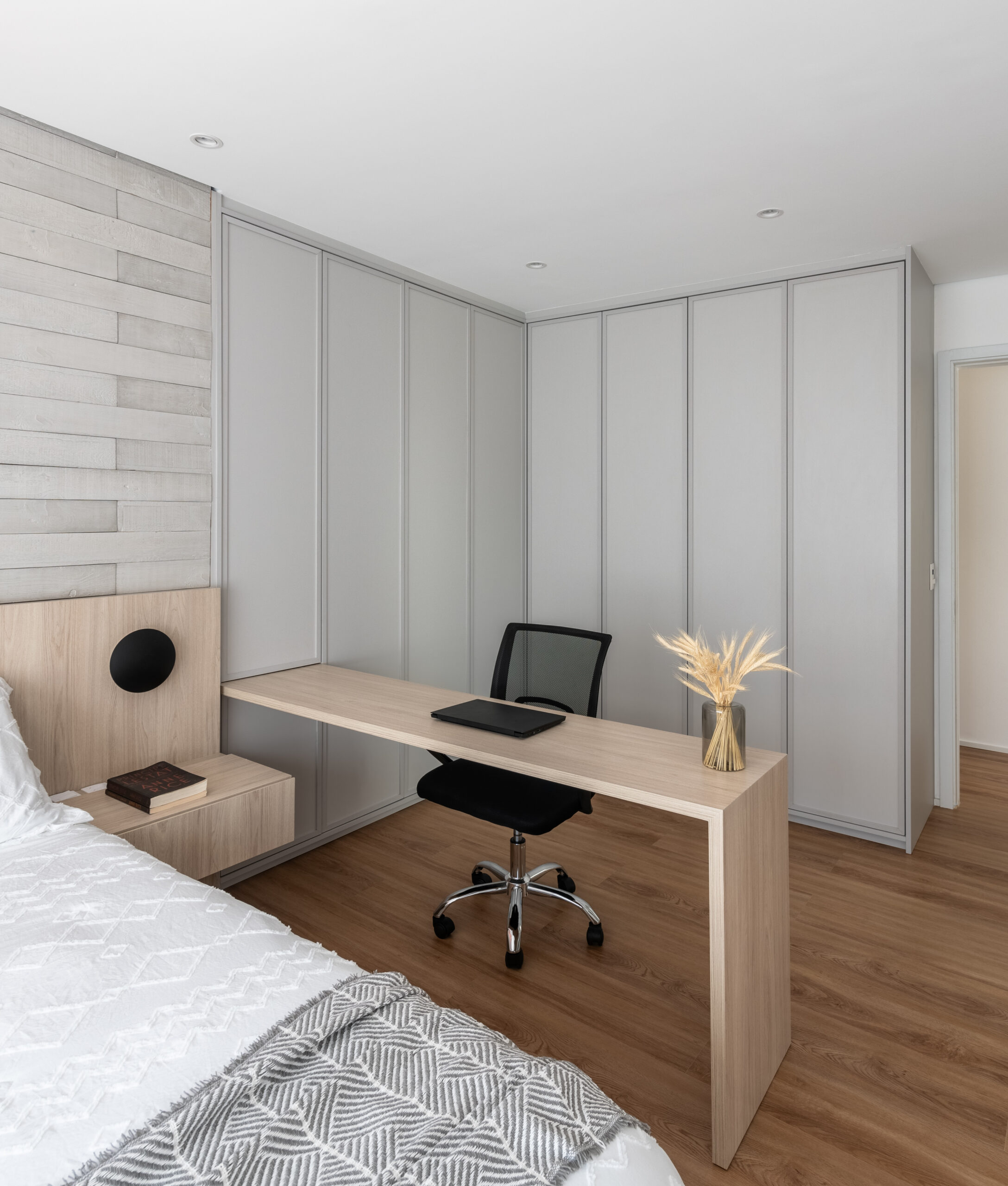 O pedido do cliente é exatamente este, criar um ambiente minimalista, com poucas cores, porém aconchegante. Um projeto inteligente aproveitando parte do que a construtora já entrega e mesclando com peças de mobiliário e decoração que ele já possui.